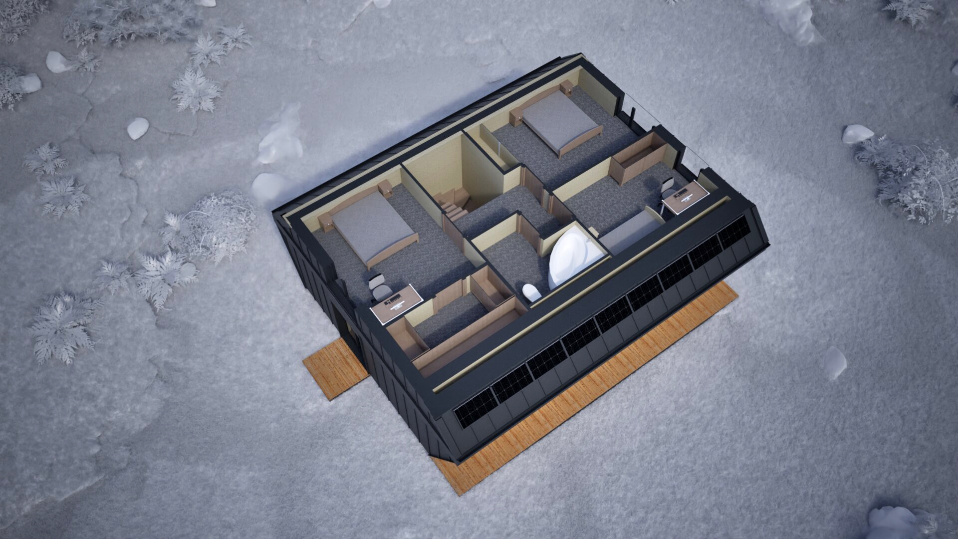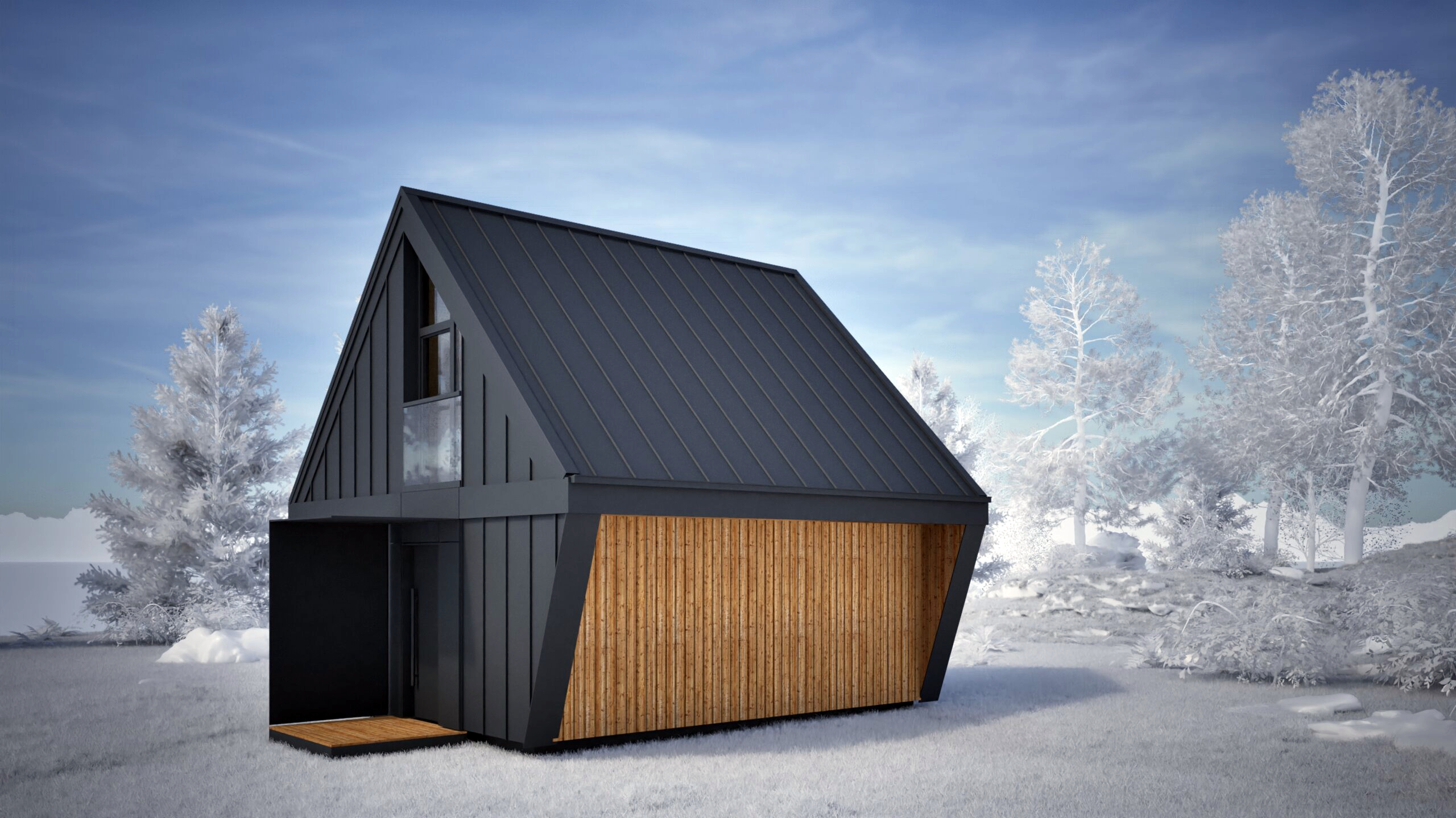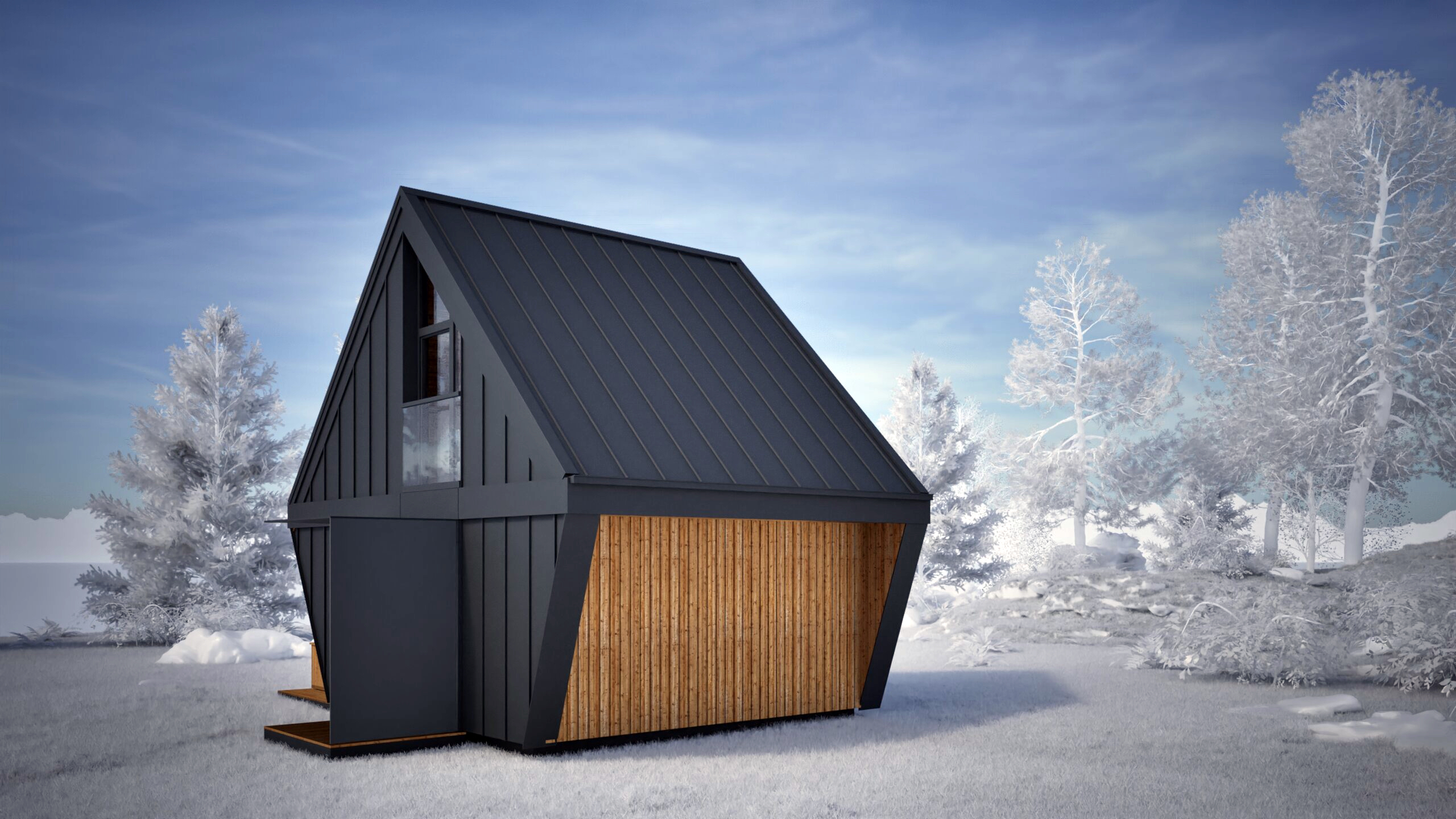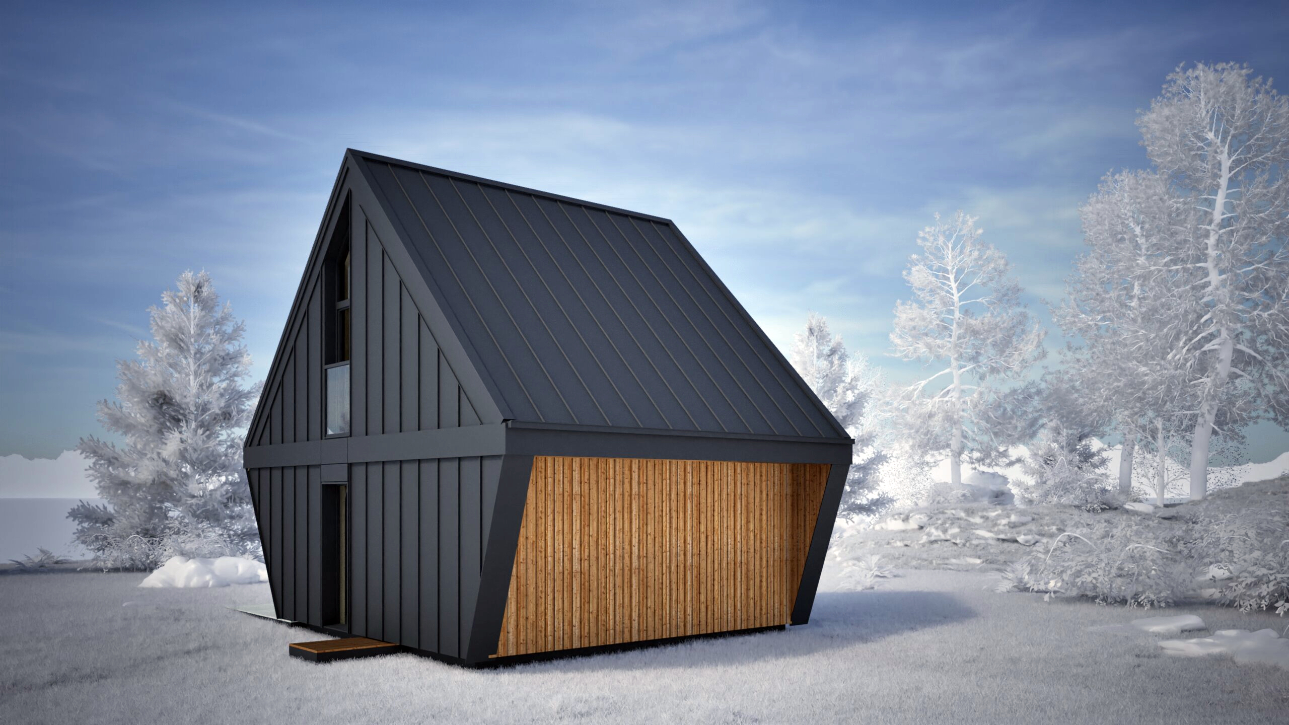 Najmniejszy z elementów bazowych – funkcjonalna przestrzeń dla singla, pary lub jako domek wakacyjny. Zawiera salon z kuchnią, sypialnię, mały pokój i dwie łazienki. Gotowy do zamieszkania od pierwszego dnia.